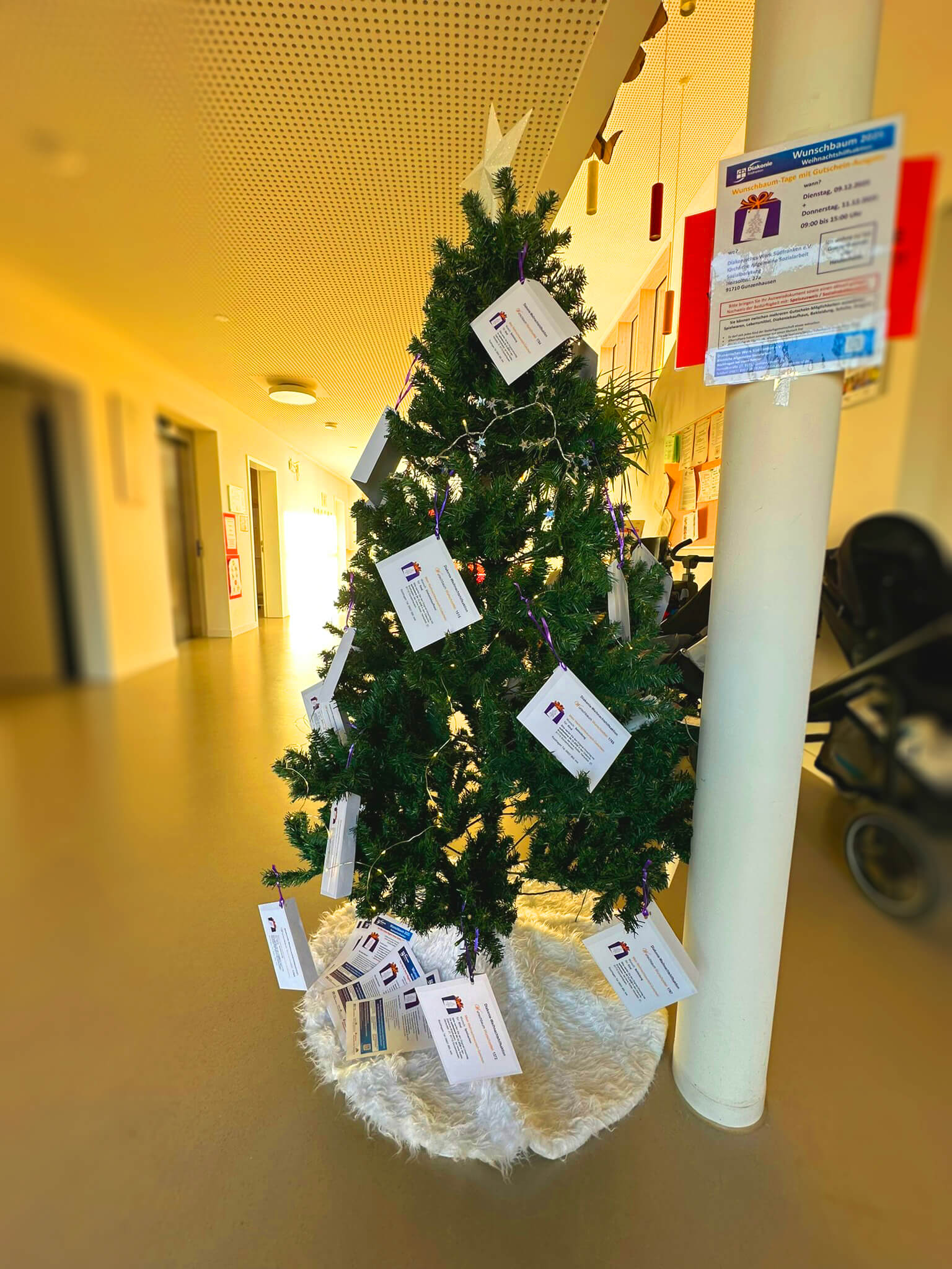 Die Diakonie stellt an unterschiedlichen Stellen im Landkreis Weihnachtsbäume mit leeren Umschlägen auf. In diesen leeren Umschlag können dann spendenwillige Menschen einen Gutschein eines Geschäftes in Höhe von ca. 25€ hineingeben und verschließen. Die Mitarbeitenden der Diakonie verteilen die so gefüllten Spenden an Bedürftige in unserem Landkreis, damit auch wirklich bei allen etwas unter´m Weihnachtsbaum liegen kann.